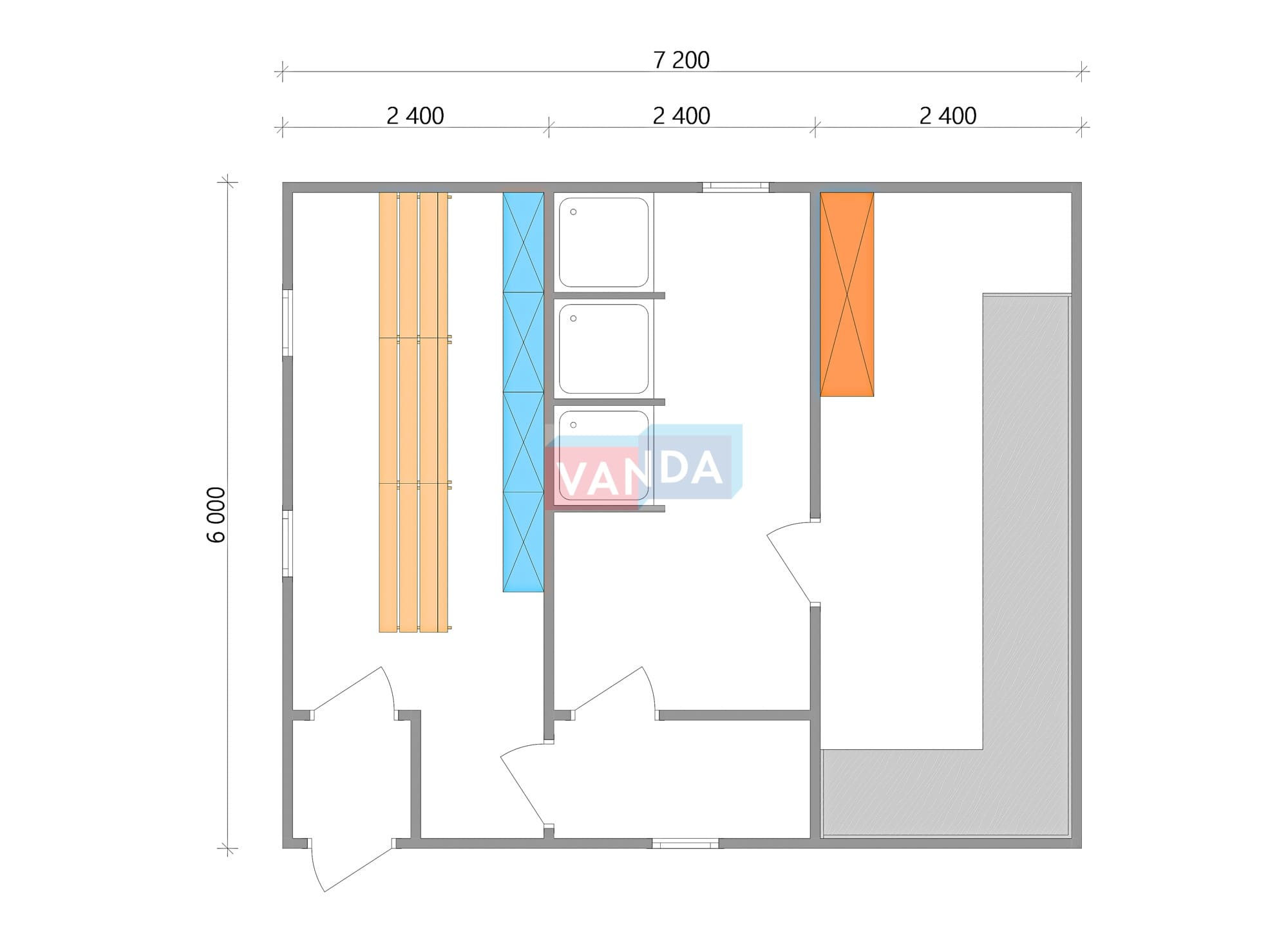 Модульная бытовка с плоской крышей 7.2x6.0 7.2x6.0 43.2 OSB 9 мм. Оцинкованный профлист 650 000 р. Уточняйте у менеджера
